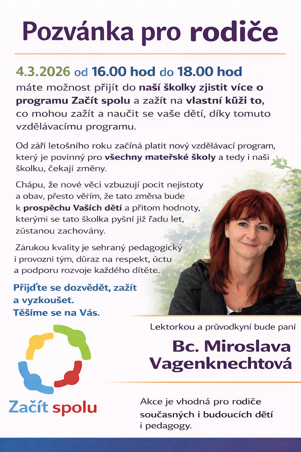 4.3.2026 od 16.00 hod do 18.00 hod navštíví naši školku paní Mg. Miroslava Vagenknechtová a ochutnávkou vzdělávání podle principů programu Začít spolu. Přijďte se dozvědět, co je to program Začít spolu, jaké přináší výhody, jaká jsou možná úskalí a hlavně vyzkoušejte jak se v programu pracuje. Program je vhodný pro rodiče současným i budoucích dětí a pro pedagogy.