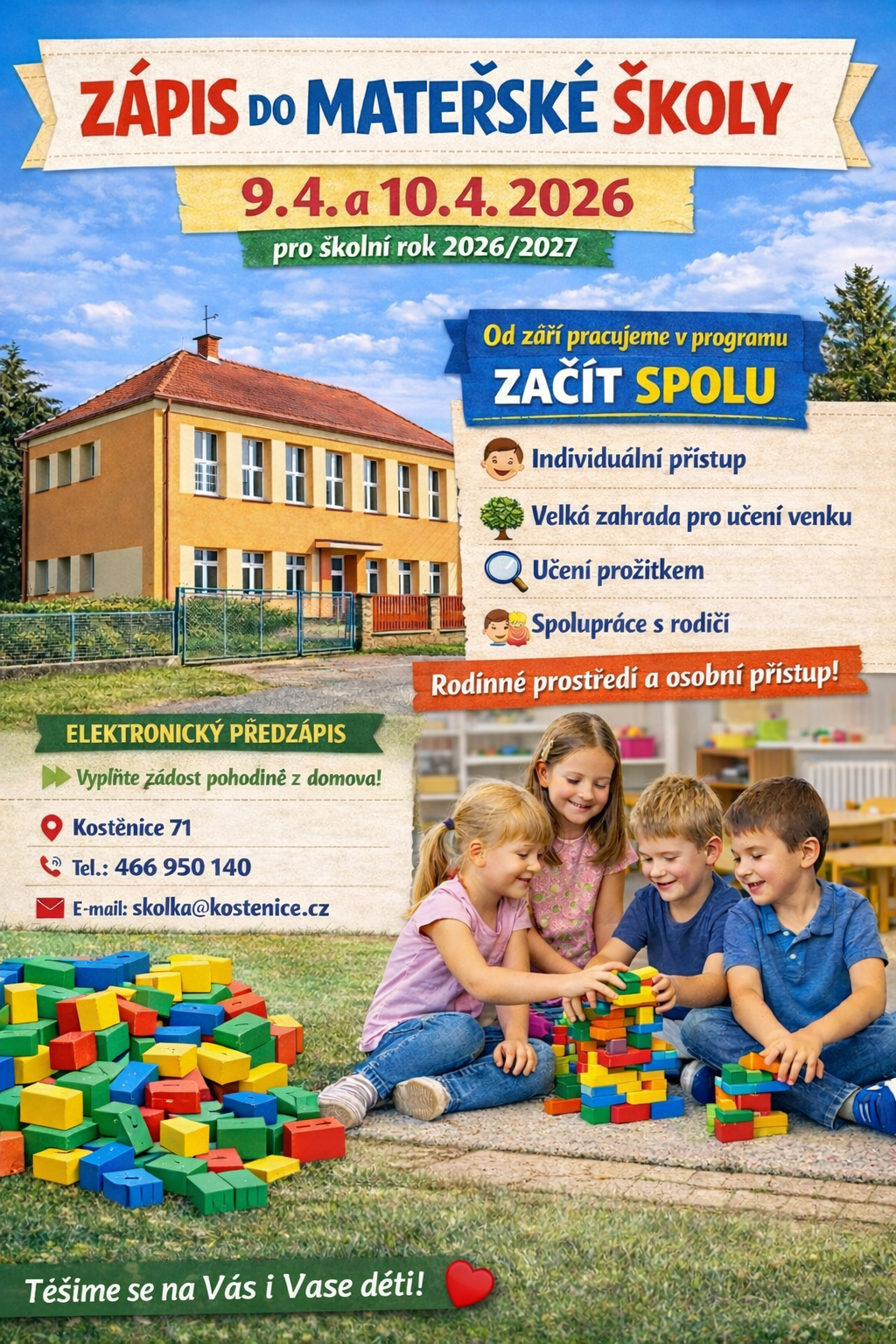 Vyhlašujeme termín zápisu do Mateřské školy na dny 9.4. 2026 a 10.4.2026